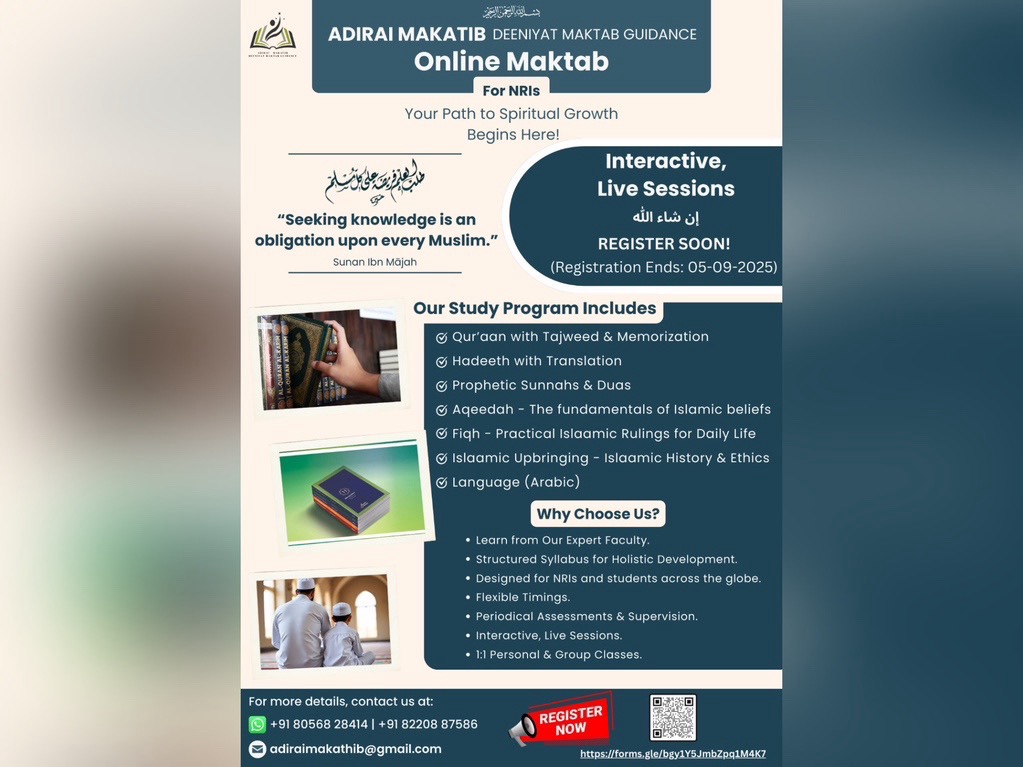 கல்வியை தேடுவது ஒவ்வொரு முஸ்லிமின் மீதும் கடமையாகும். மார்க்கக் கல்வியை ஆர்வத்துடன் கற்க விரும்பும் வெளிநாடு வாழ் இந்தியர்களுக்காக பிரத்யேகமாக இந்த அதிரை மகாதிப் தீனியாத் மக்தப் வழிகாட்டின் ஆன்லைன் வகுப்புகள் வடிவமைக்கப்பட்டுள்ளது.