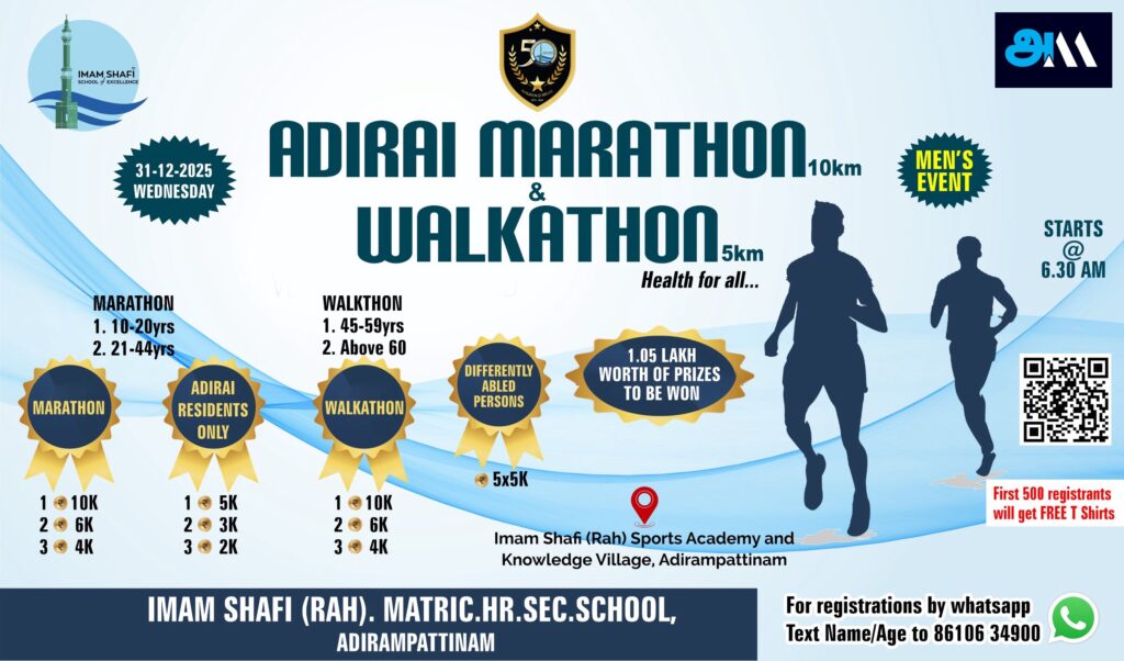 அதிரை மாரத்தான் மற்றும் வாக்கத்தான் போட்டிகள் நமதூர் இமாம் ஷாபி பள்ளியில் வரும் (31/12/2025) புதன்கிழமை காலை 06.30 மணிக்கு தொடங்க உள்ளது. 50 வருட பாரம்பரியம் மிக்க இமாம் ஷாஃபி பள்ளியின் மாரத்தான் மற்றும் வாக்கத்தான் போட்டிகள் இரண்டு பிரிவுகளாக நடைபெற உள்ளன.