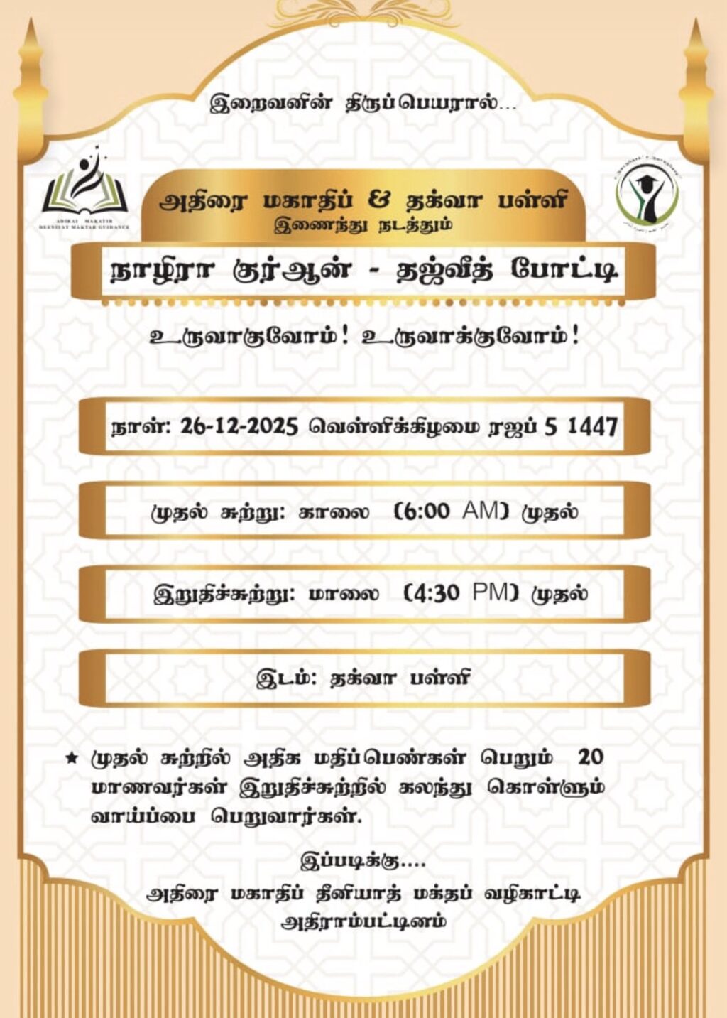 அதிரை மகாதிப் & தக்வா பள்ளி இணைந்து நடத்தும் நாழிரா குர்ஆன் – தஜ்வீத் போட்டி இன்ஷா அல்லாஹ் இன்று (26/12/2025) காலை முதல் சுற்று 6 மணி முதல் 8 மணி வரையும் இறுதிச்சுற்று மாலை 4:30 மணி முதல் இஷா வரையும் அதிரை தக்வா பள்ளியில் நடைபெற இருக்கிறது.