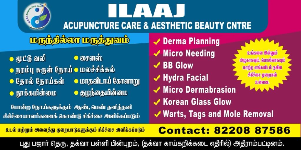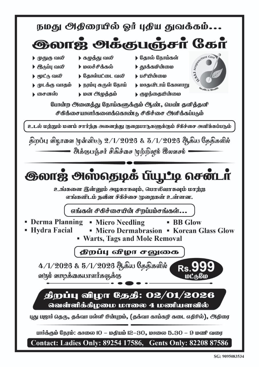 திறப்பு விழாவை முன்னிட்டு (02/01/2026 & 03/01/2026) ஆகிய தேதிகளில் அக்குபஞ்சர் சிகிச்சை முற்றிலும் இலவசம்.