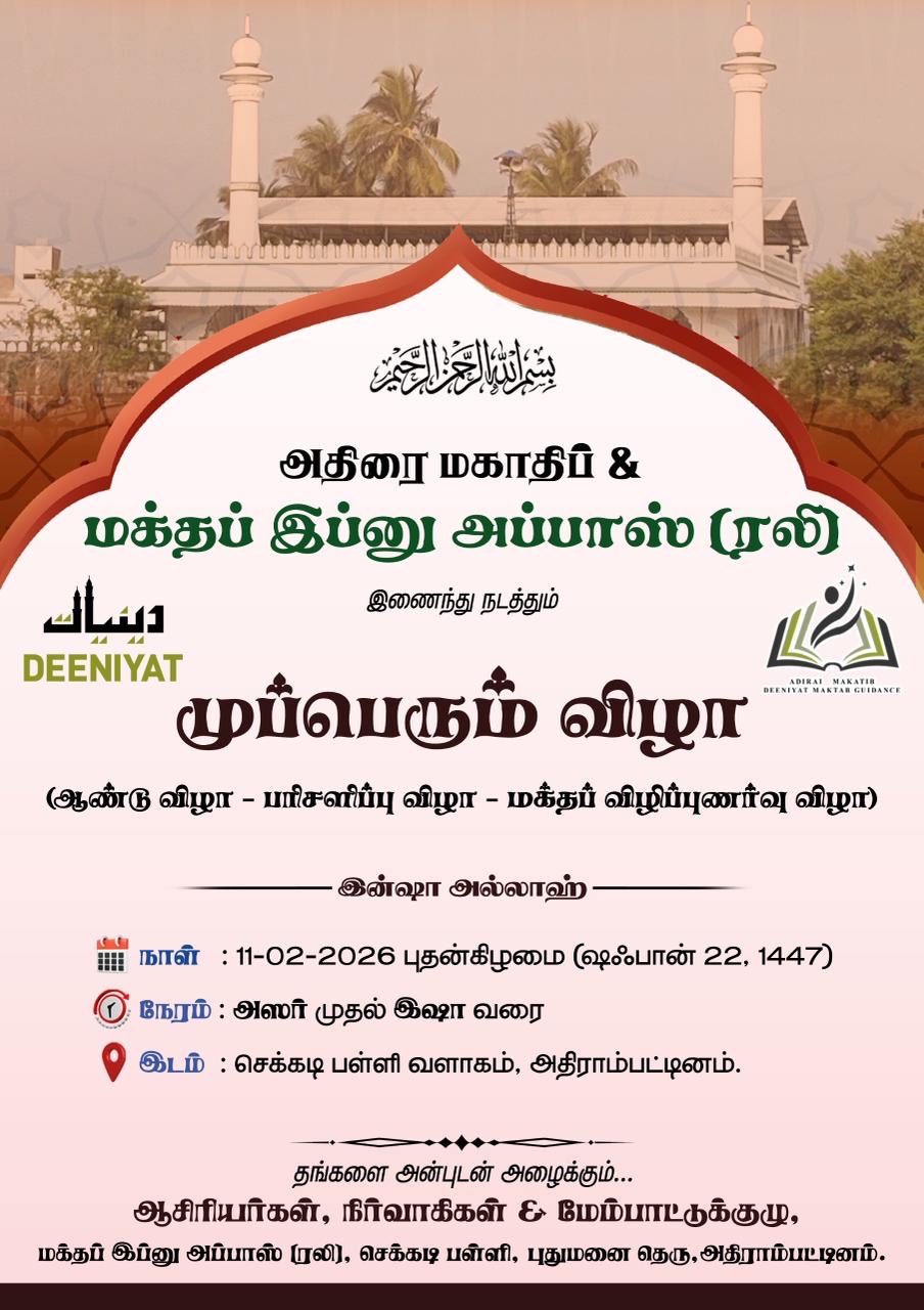 இந்நிலையில் அதிரை மகாதிப் & மக்தப் இப்னு அப்பாஸ் (ரலி) இனணந்து நடத்தும் (ஆண்டு விழா – பரிசளிப்பு விழா – மக்தப் விழிப்புணர்வு விழா) என முப்பெரும் விழா இன்ஷா அல்லாஹ் வருகின்ற (11/02/2026) அன்று மாலை அஸர் முதல் இஷா வரை செக்கடி பள்ளி வளாகத்தில் நடைபெற இருக்கிறது.