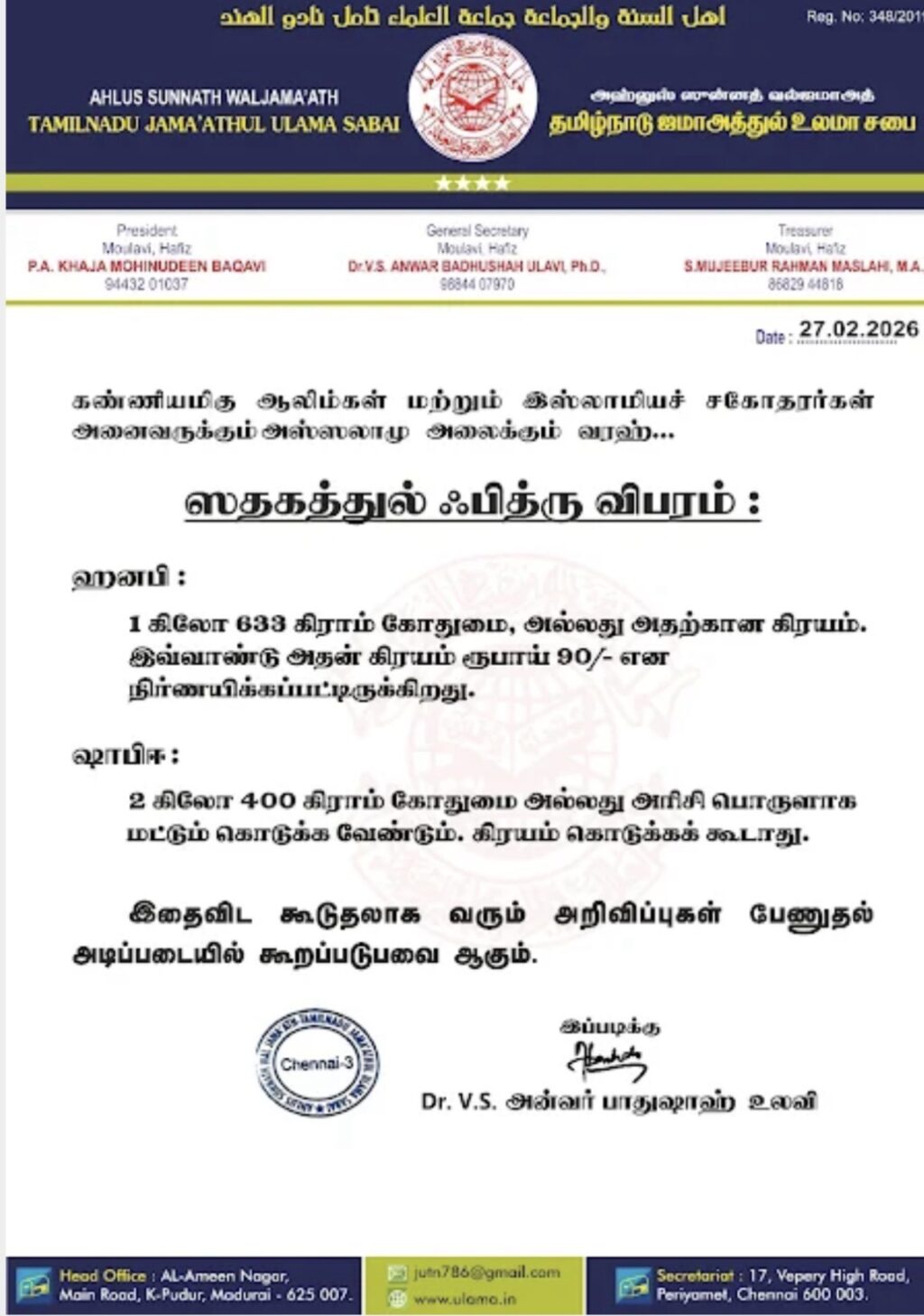 பித்ரா எவ்வளவு கொடுக்க வேண்டும்? ஜமாஅத்துல் உலமா சபை வெளியிட்ட முக்கிய அறிவிப்பு!