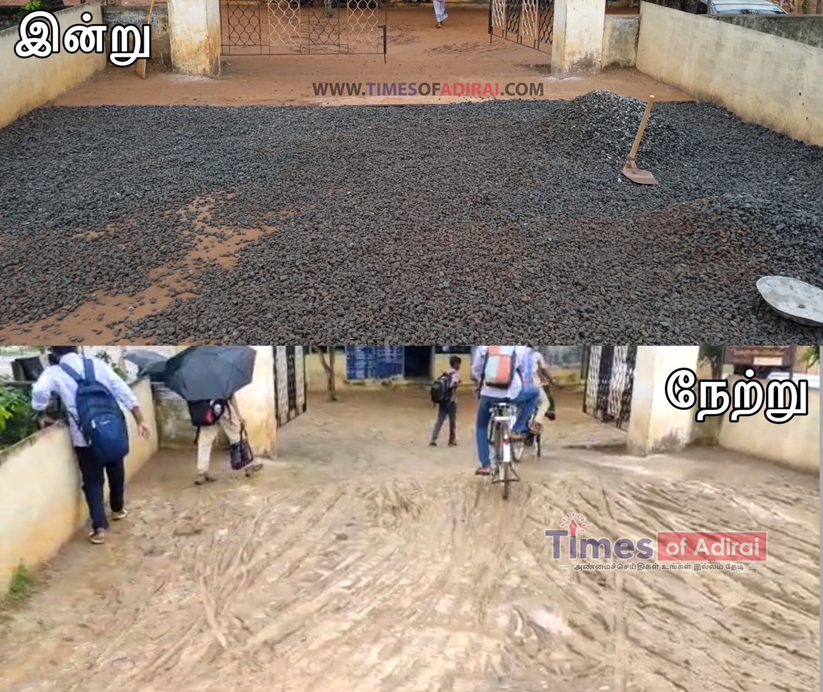 தஞ்சாவூர் மாவட்டம் அதிராம்பட்டினத்தில் கடந்த சில நாட்களாக கன மழை பெய்து வருவதால் பல்வேறு இடங்களில் சாலைகள் மேடும் பலமாகவும் இருந்து வருகிறது, அதனையடுத்து அதிரை காதர் முகைதீன் ஆண்கள் மேல்நிலை பள்ளிக்கு செல்லும் நுழைவில் சேரும் செவதியுமாக காணப்பட்டது, இப்பள்ளியில்